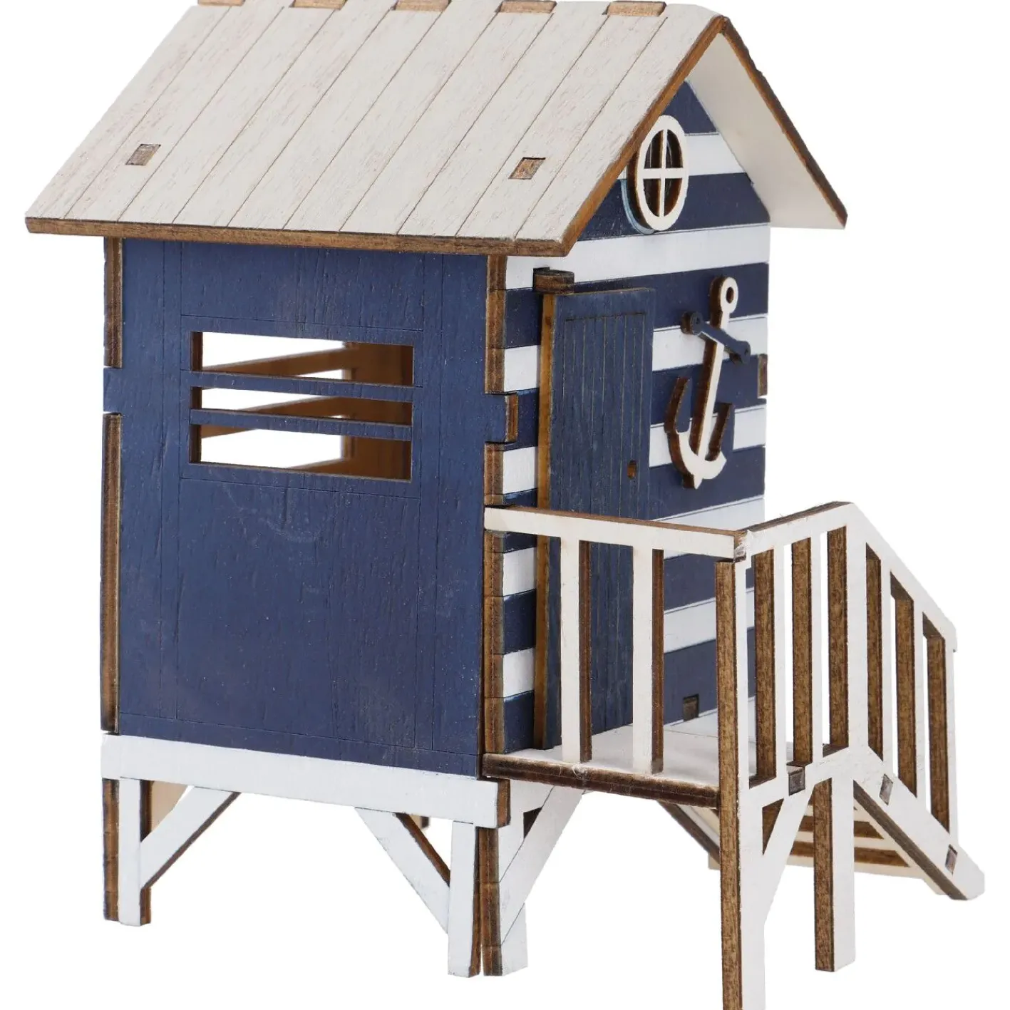 Du suchst noch nach einem passenden Strandhaus? Dieses hier kannst du vielleicht nicht bewohnen aber dennoch ist es ein hübsches Häuschen, welches dein Zuhause verschönern wird. Es ist aus Holz gefertigt und sorgt mit Stelzen, Anker und Streifen-Look für einen maritimen Flair.