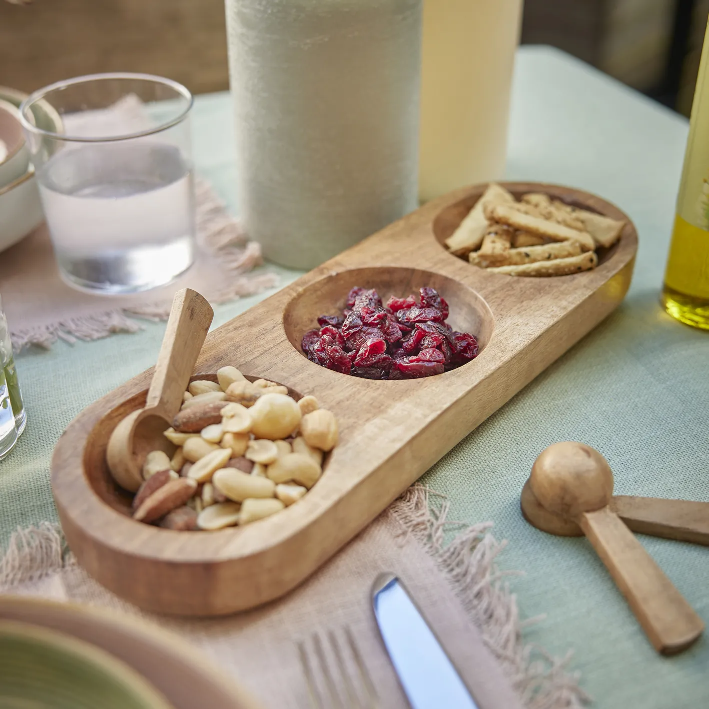 Diese Holzschale mit drei Vertiefungen verleiht deinem gedeckten Tisch eine natürliche Note. Nutze sie für Gewürze, Dips oder andere Kleinigkeiten, die du servieren möchtest.