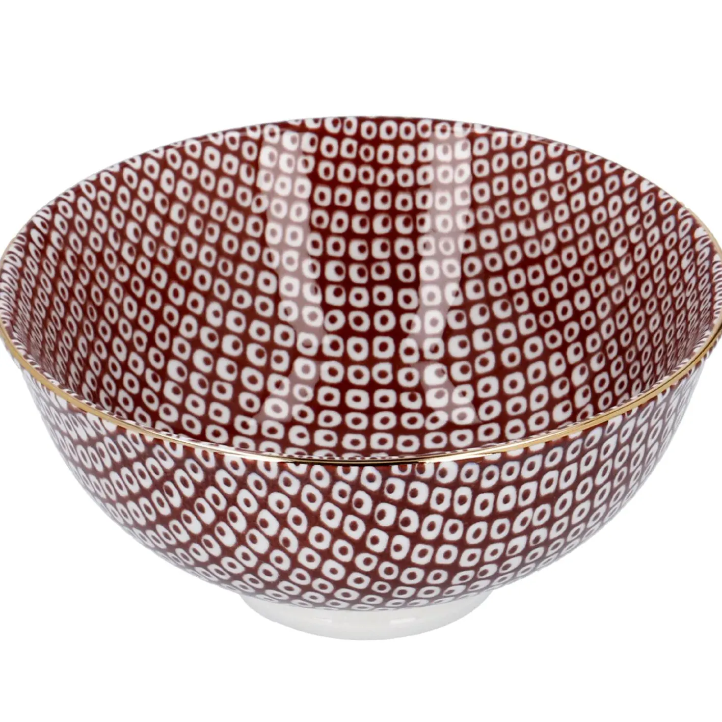 Serviere deinen Gästen Tapas, Snacks und andere kleine Leckereien in dieser bordeaux-weißen Schale aus Porzellan mit Muster und Goldrand. Durchmesser: 12 cm.Die Größe und das Gewicht beziehen sich auf eine Schale.