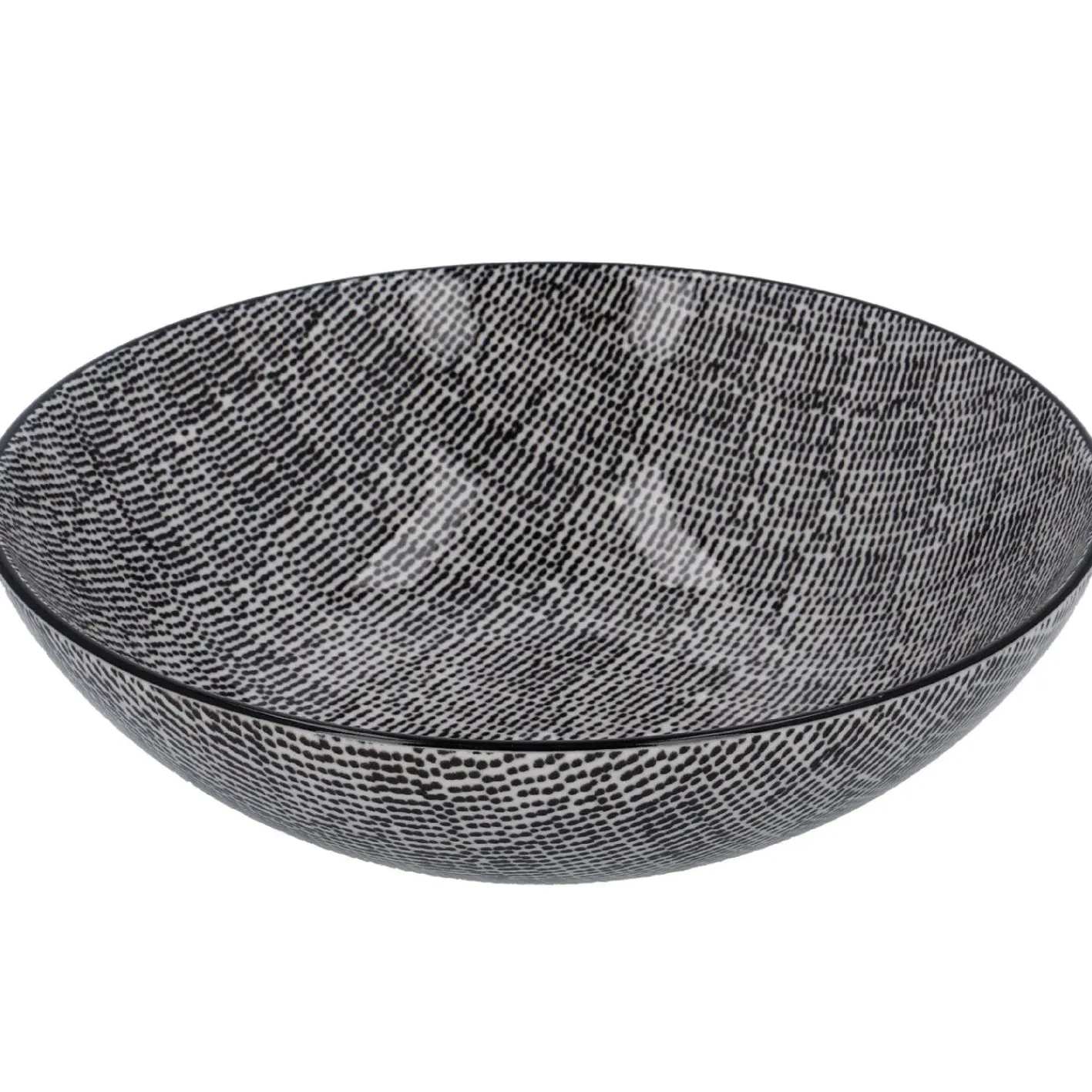In dieser Servierschüssel finden sowohl Salate als auch Obst ihren Platz.Aber nicht nur für Lebensmittel sondern auch als Dekoelement auf einem Sideboard oder dem Esstisch macht sich diese schwarz-weiße Schüssel besonders toll. Füllmenge: 1360 ml