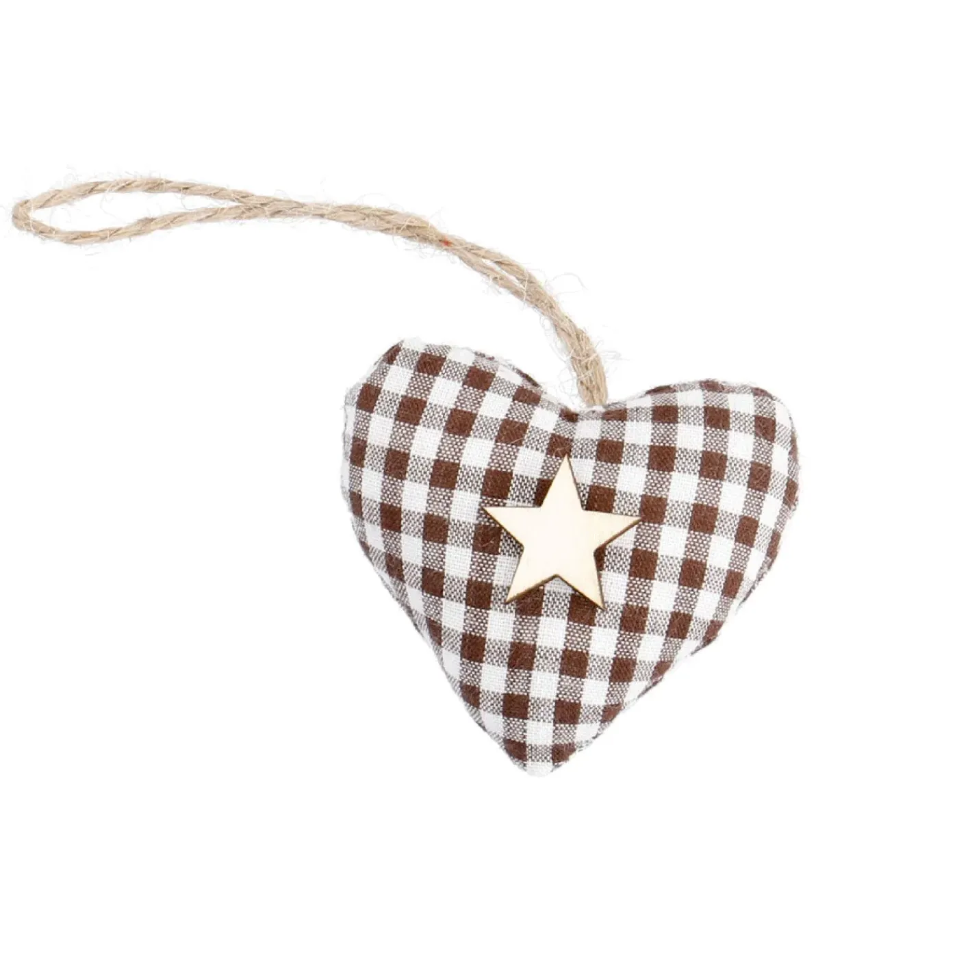 Kleine Details für Weihnachten: Ob als Anhänger am Baum, Geschenk oder Adventskranz – der Herz-Anhänger mit kleinem Holzstern im braun-weißen Karomuster ist das kleine i-Tüpfelchen.