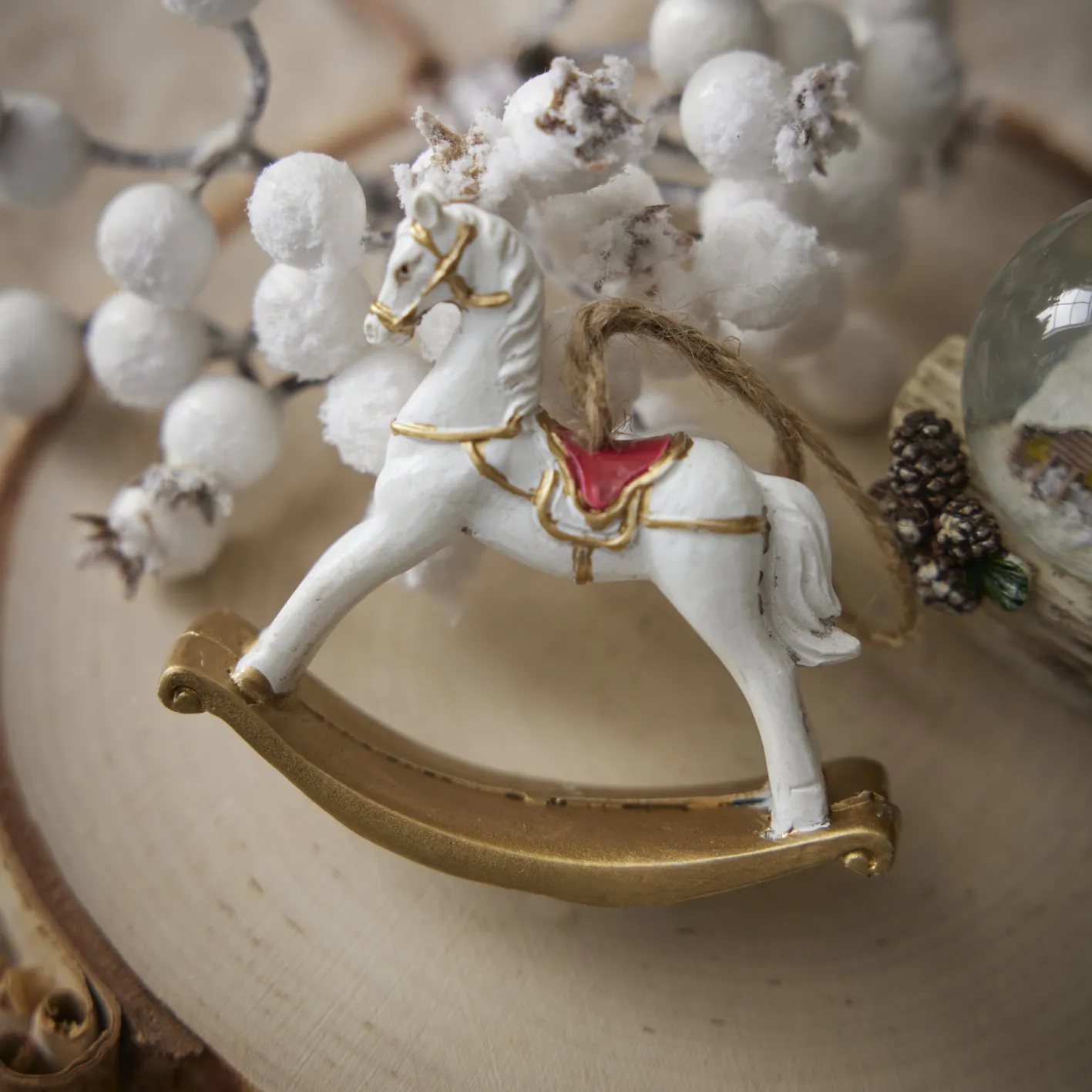 Traditionelles Weihnachten kann so schön sein – vor allem mit diesem nostalgischen Schaukelpferd in weiß. Es ist aus Polyresin gefertigt und verfügt über eine Schlaufe, an der es aufgehangen werden kann.