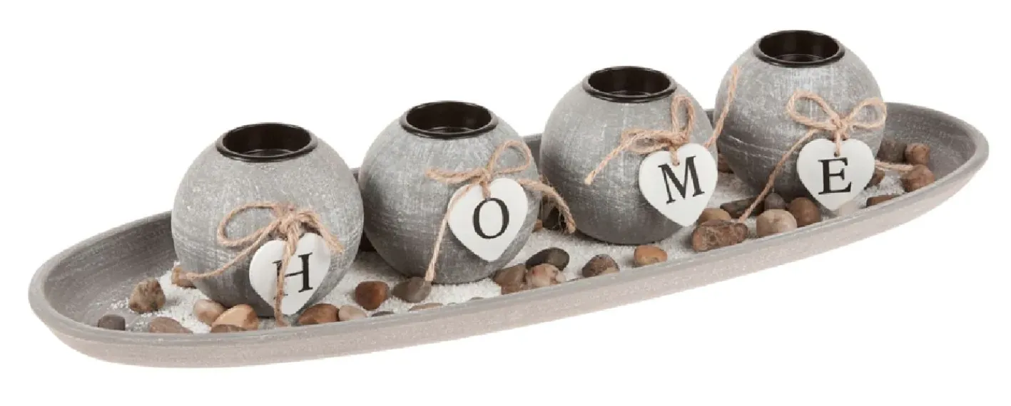 Dieses Deko-Set besteht aus einem ovalen Holztablett, Teelichthaltern, Sand und Steinen. Eine schöne Deko für deine Küche, dein Bad oder dein Wohnzimmer.