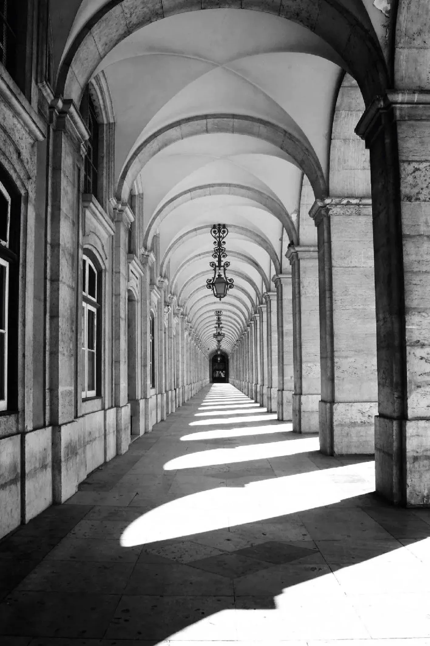 Ein ganz besonderer Hingucker ist dieses klassische schwarz-weiß Poster. Es zeigt einen langen Korridor und die Sonnenstrahlen sorgen für schöne Muster auf dem Boden.