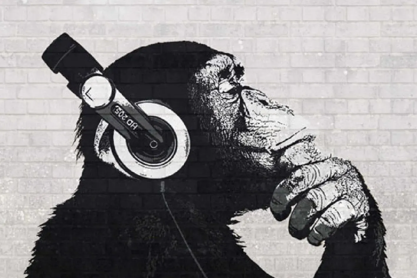 Cooles schwarz-weiß Poster mit einem Affen, der Musik hört. Ein tolles Poster für Musikfreunde.